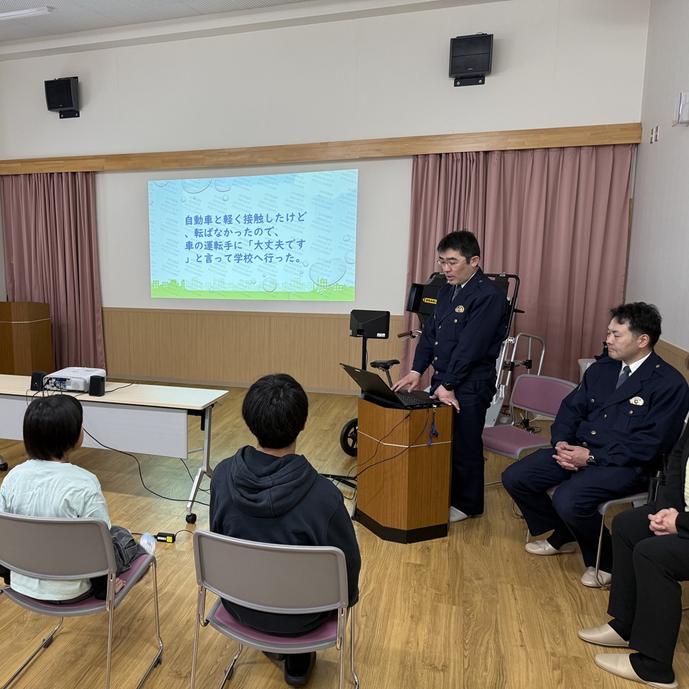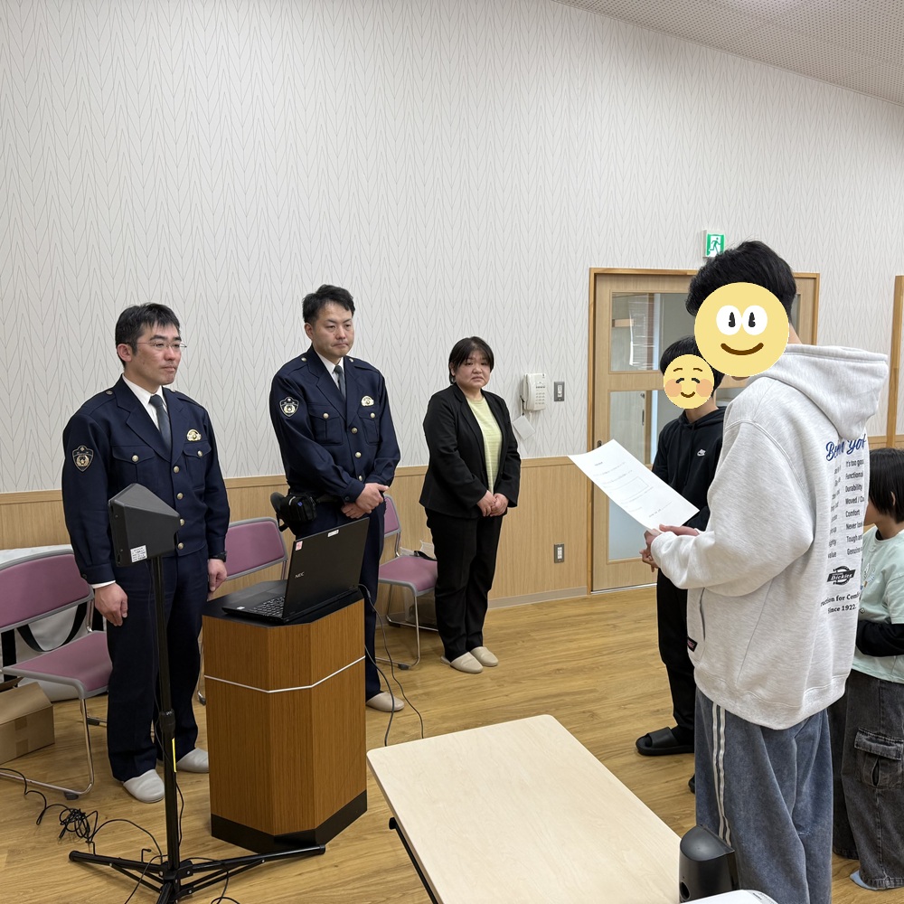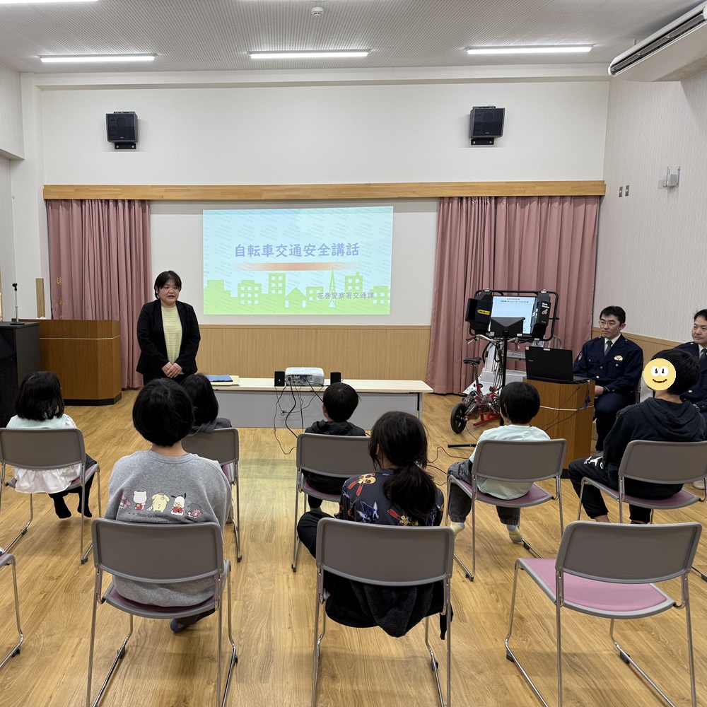 先日、花巻警察署と石鳥谷交番の皆さんにお越しいただき、小学生以上の児童を対象とした「交通安全&防犯教室」を開催しました!当日は学校の行事と重なり、参加人数は10名ほどと少なめでしたが、その分、一人ひとりに寄り添ったとても丁寧な時間となりました。